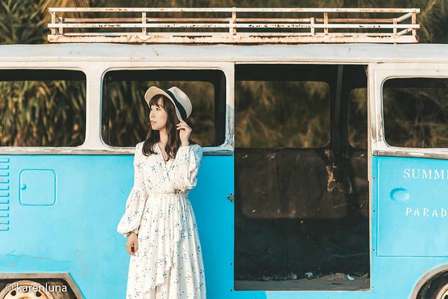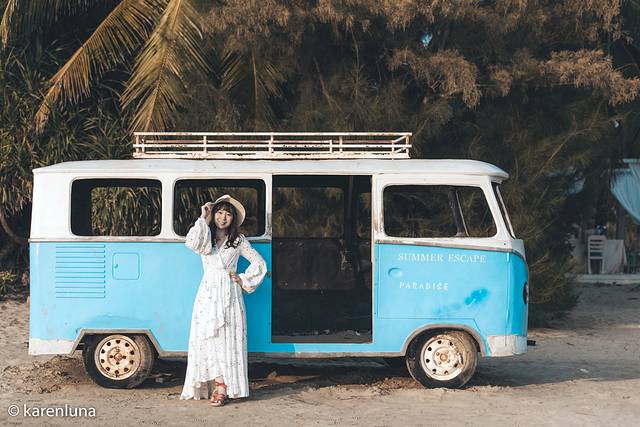 而在沙滩上的蓝色小轿车却正好无人。个人认为这是整个 三亚 婚纱摄影基地里最好拍照的一个场景了!无论是站在车前,还是走进车内从车窗探出身子,亦或者爬上车顶,都非常出片。日落的柔光正好打在身上,柔和而又浪漫。