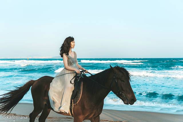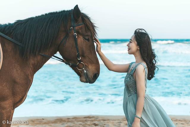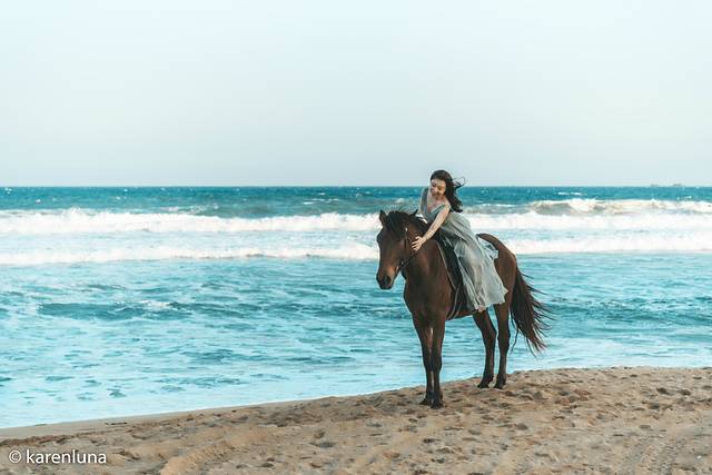 下午在酒店泳池拍完照,就赶紧回房间换上了飘逸的裙子。来到沙滩的时候,小哥哥已经带着马在沙滩上等候啦。