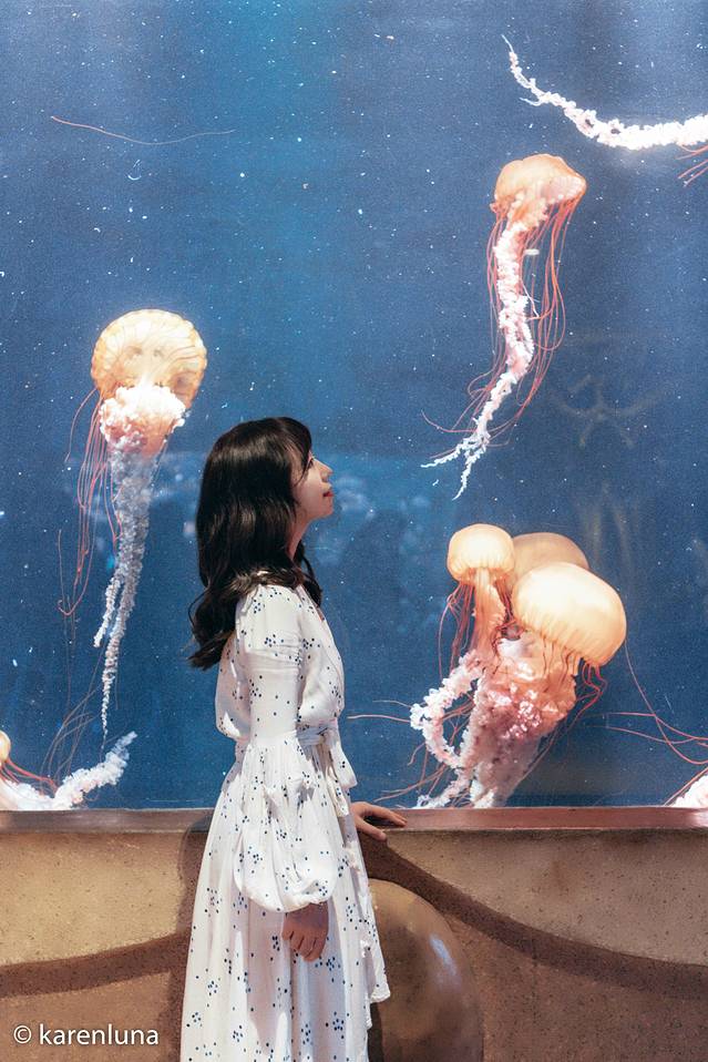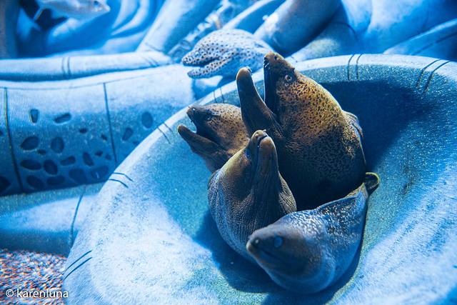 慵懒的挤在一团的海鳗、吸在玻璃上的吸盘鱼、彩色的梦幻的水母、悠闲遨游的海龟,水族馆内一共拥有着大大小小30多个互动展示池,汇集的海洋生物种类真是数不胜数。而且每个水族箱旁边都有中英文简介,在观赏海洋生物的同时,还能了解不同生物的名称和习性,玩乐的同时还增长了不少知识。