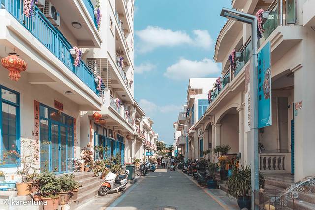 这个新晋网红拍照地其实是位于天涯区的天涯镇,距离著名景点“天涯海角”非常近。说是小镇,其实是一处没有被商业开发的普通居民区, 只不过因市政统一要求将房子外墙刷成了白色、门窗刷成蓝色,而变成了游客口中的白蓝小镇。