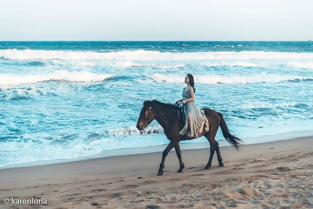 出发之前就看到网上有不少在海中骑马的照片,说实话当时并没有心动。但当前一天在酒店沙滩上闲逛时看到一个身材完美帅气逼人的姑娘骑着健壮的骏马从我身边走过的时候,那英姿飒爽的气场完全吸引住了我,瞬间种草。问了价格总觉得拍摄时间略短,很担心妈妈这个专属摄影师能否胜任,犹豫再三选择了放弃,但回到房间就一直念念不忘了一个晚上。本着不后悔的心态,还是联系了马主人,约着日落十分在酒店沙滩上骑马拍照。