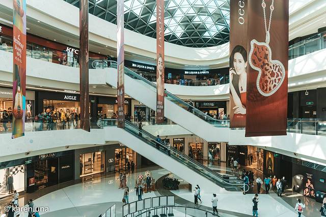 免税城被分为了AB区,由3层的室内天梯相连。A区是大家都爱的香化区和部分大牌专柜, 比如 Gucci、Fendi、BV、Burberry、 Valentino、Coach等等。而B区则是精品区,除了国际大牌的Loewe、MaxMara、Prada、Miumiu外,还有很多钟表珠宝、儿童服装、健康食品等等的专柜。