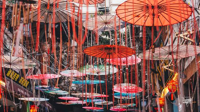 仙气飘飘的街道,挂满各色的纸伞,伞边的流苏款款飘下,惹得我这钢铁直男都忍不住停下脚步,拍几张照片。