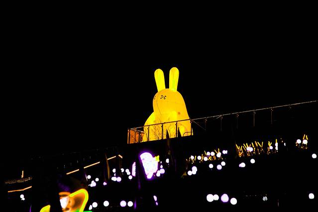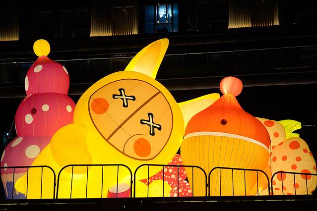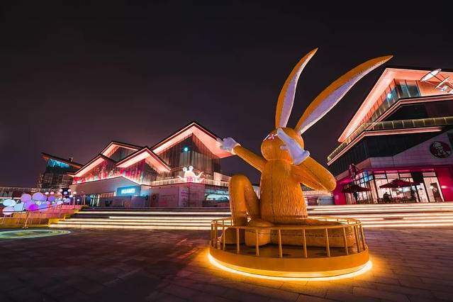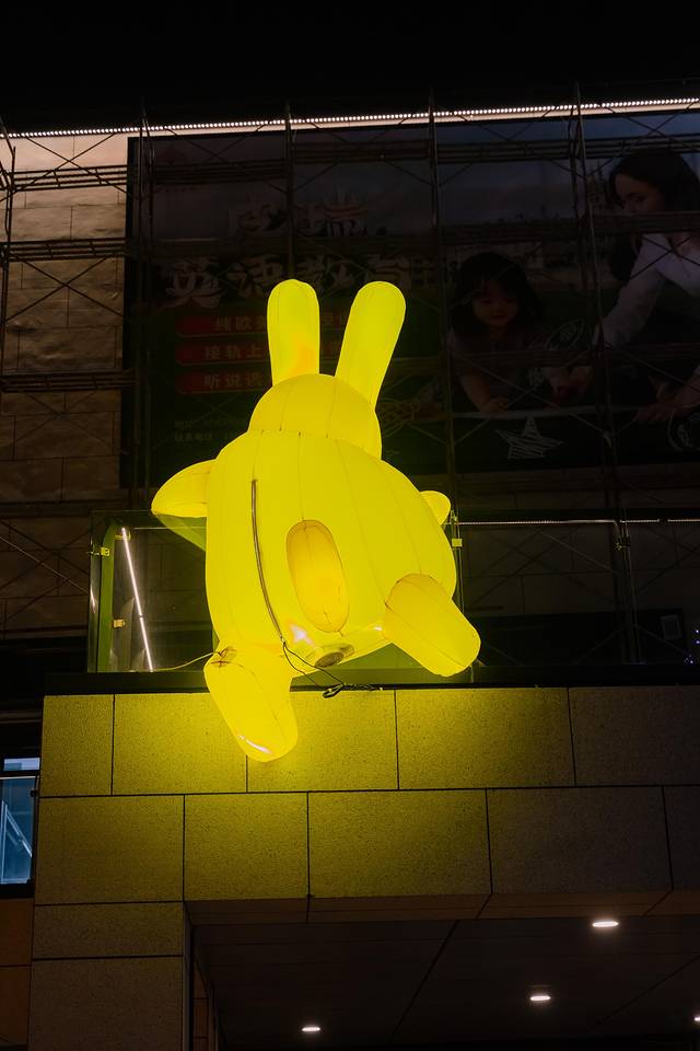 广场内设置了不少拍照打卡点,上次看到的那只位于大阶梯处的X眼黄兔子现在多了几个胖版的,趴着的斜着的坐着的都有,还挺萌,街区上空还吊了一个天使,我跟同伴盯着这个天使笑了大半天。