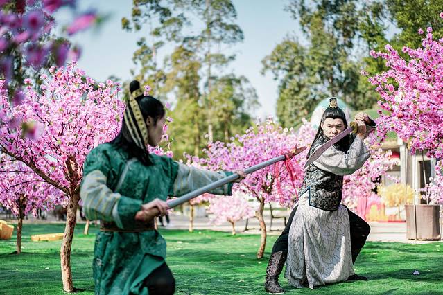 在桃花岛,不仅可以赏花,还可以体验江湖大侠快意恩仇的场景。桃花树下,江湖大侠,路见不平,拔刀相助,在桃林中刀光剑影地决斗。在这里,可以体验仗剑走江湖的快意人生。