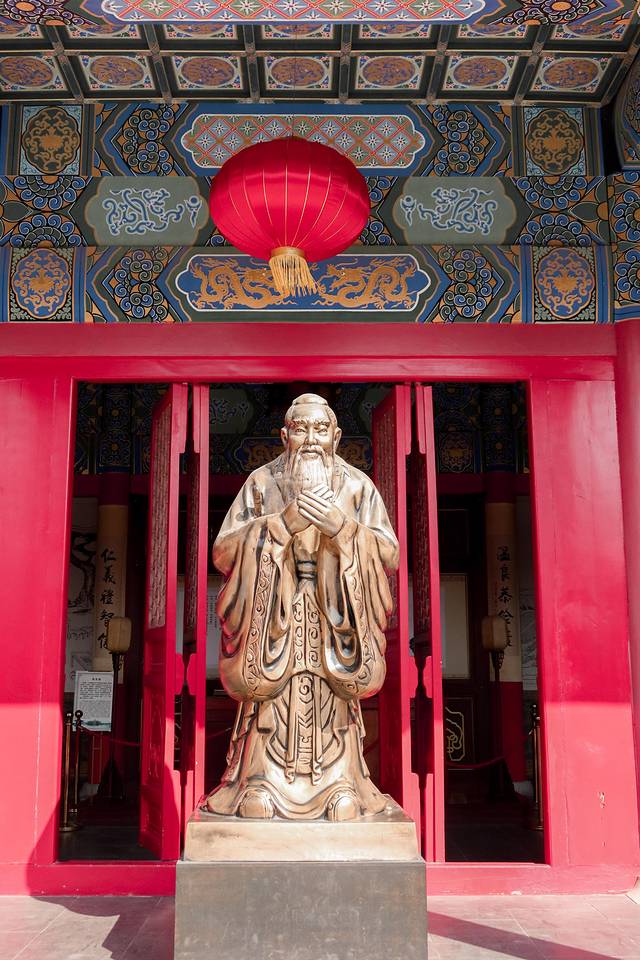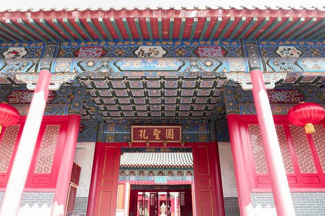 孔圣园整体气势恢宏,宫殿灰瓦红墙再阳光下泛着古色古香的时光气息,使人油然而生庄重威严的感觉。大成殿是孔圣园的主体建筑,而孔子的雕塑便伫立在大成殿门口,端庄肃穆。