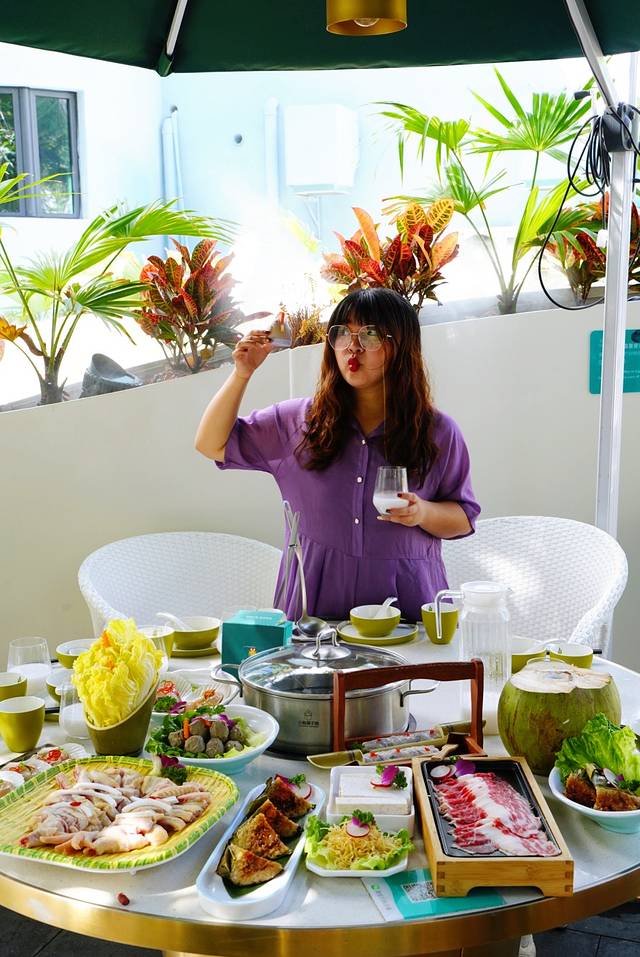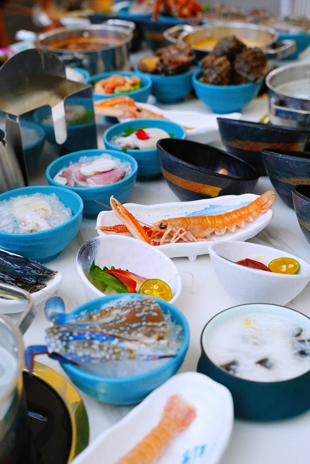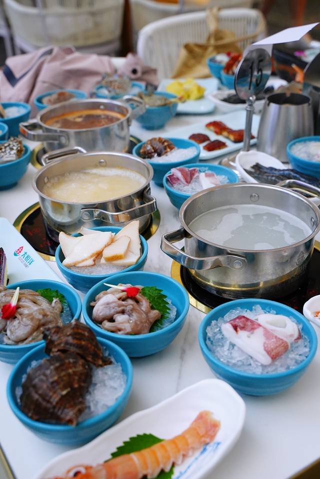 一人一个小火锅,清汤、麻辣、糟粕醋三种本地地道锅底选择。除了可以煮海鲜,这里的涮品种类也相当丰富。