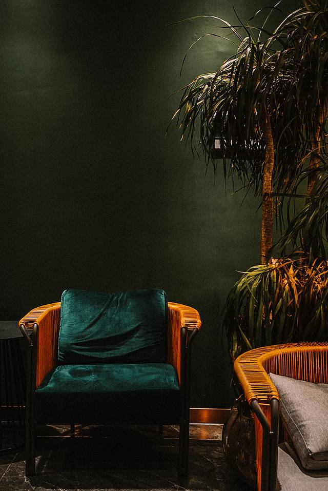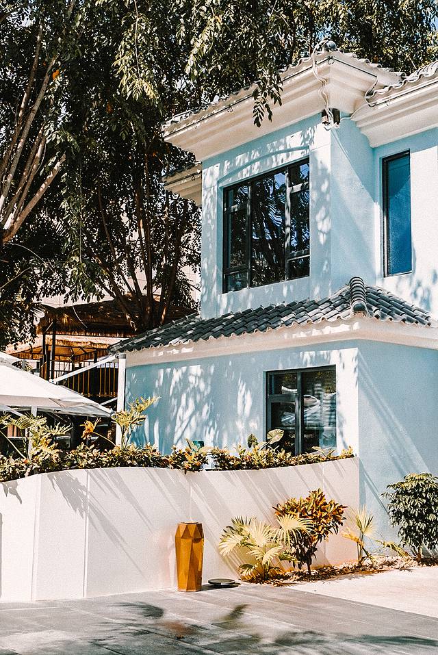 外面是蓝色建筑,纯白色的外围墙面和莫兰迪绿的内墙,光是色彩搭配就很治愈啦!