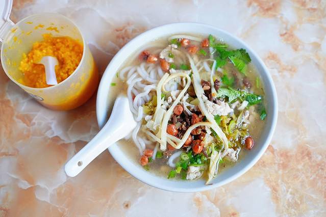 后安粉是我忍不住吃了几次,当地人叫做『粿汤』,将河粉放入滚水中快速氽烫捞出,配以新鲜的切成薄片的瘦猪肉、粉肠、大肠、猪杂、鱼饼、炸鱿鱼丝以及香菜、葱花和芹菜等配料,再倒入由猪骨、海鲜熬制的混合高汤。老板告诉我,加点 海南 胡椒粉更好吃