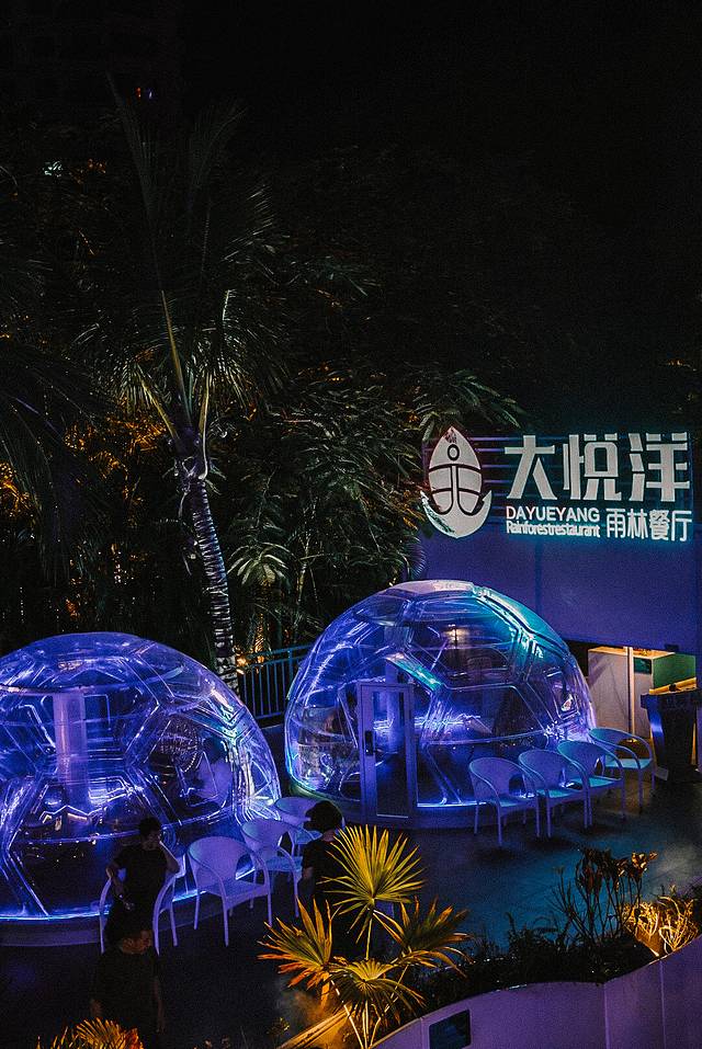 在“大菠萝”里的大悦洋海鲜自助餐厅,是海南首家感官级别的3D餐厅。餐厅的入口仿佛是一个巨大的贝壳,而走进去则像到了龙王的水晶宫。内部装修以海洋为主题,各种水母、贝壳等造型的灯饰,奇光异彩,特别梦幻。