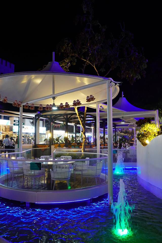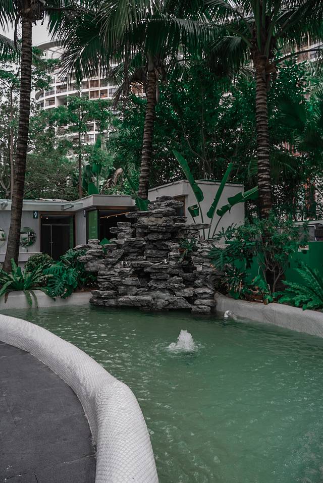 水池里的灯光与喷泉随时变幻着节奏舞动,随处可见的绿植加上人工云雾,仿佛置身热带雨林一般,仙气满满~整个餐厅设计是个综合美食院子,满满的网红ins风~