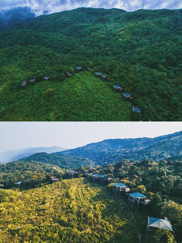 在高黎贡山森林的边缘,1000米长的高空栈道优美地延展,将15顶自然探险风格的客房帐篷与5个公共空间抬升到了树梢之上,是当之无愧的“空中帐篷营地”。