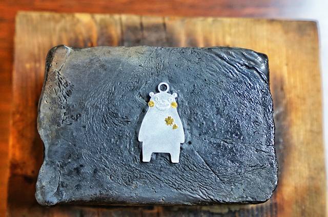 将小小的纯金和纯银饰物,用镊子小心地放在熊形铁板上后,接着再用小槌仔细地敲打。