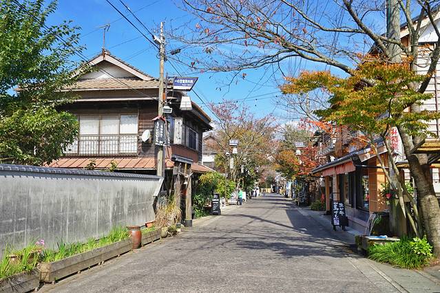 和其他名胜前的步行街不同,这里街道两旁的店铺兜售的都是些当地特色的产品。店铺的门面被装饰成古朴的风格,一些小物也都由店主从各地收集而来。买了小吃,可以选择坐在门前慢慢品尝。在冬季,如果是雪后,坐在烤炉旁一边吃小吃一边欣赏雪景,便成了日本偶像剧的主角。