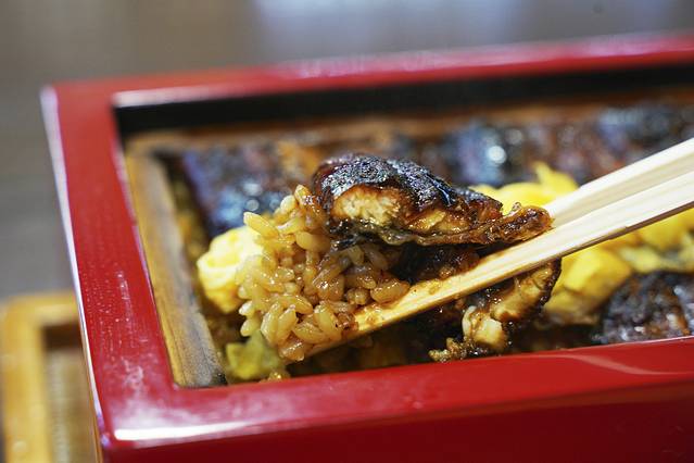 我们点的是“蒸鳗鱼定食”,打开红色漆器盒盖,一股淡淡的蒸汽扑面而出,同时也伴随着一股浓浓的鳗鱼香。浸满褐色酱汁的米饭上普铺着大片鳗鱼,鸡蛋下面还垫着一大片鳗鱼。这是店内最大份量的鳗鱼饭,压在下面的米饭吸足了汤汁,别提多香了。