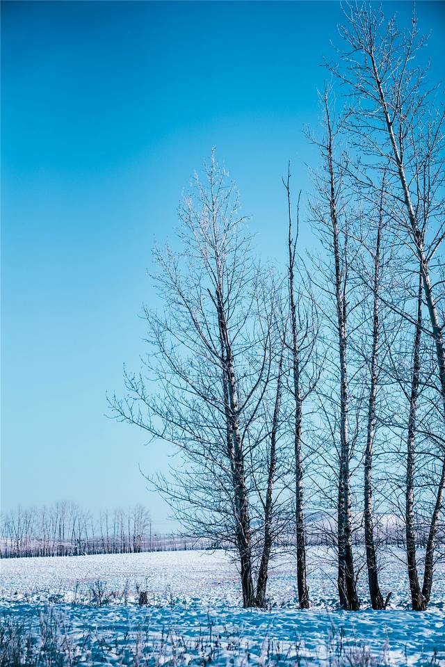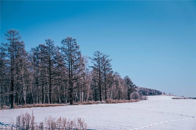 两旁的风景从白茫茫一片的雪原,变成了簇拥在积雪之上的一片片白桦林,白桦树只剩下光秃秃的树干和枝丫,连成一片之后在积雪上形成低饱和度的树林,灰色调的色彩透露出寂寥和荒凉。