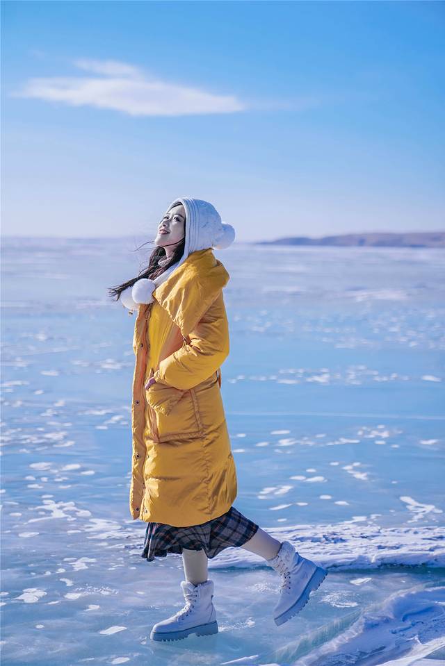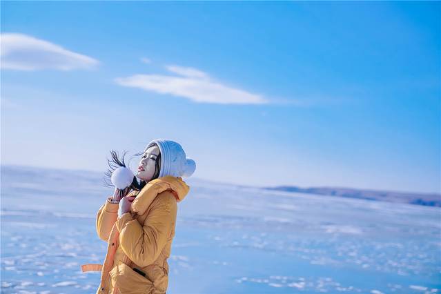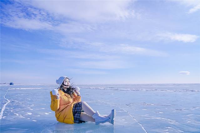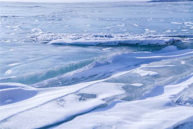 呼伦湖非常大,大到望向湖的方向时完全看不到尽头,与天相接的地方还是冰湖,湛蓝的天空没有一丝瑕疵,冰湖上面大概受风力的作用,冰面被吹得凹凸不平。而是偶尔出现小小的坑洼或是裂痕,这种凹进去的坑洼和裂痕里面藏着白色的积雪,其它藏不住的积雪都被狂风吹送着掠过冰面飘向远方。