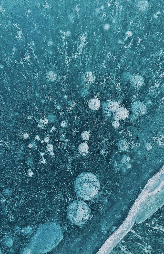 从高空处看,白色的坑洼成了蓝色冰湖上的点点花纹,使得这片冰湖不仅仅是单调的颜色。我仔细地看湖面,透过深不见底的冰面,可以清楚地看到在冰层里面凝固了的气泡,或许是湖面在结冰时正在升起的水泡,此刻凝固着被定格在冰层里面,非常神奇。原本想在 贝加尔湖 畔看气泡冰,没想到能够在这里实现,梦幻至极。