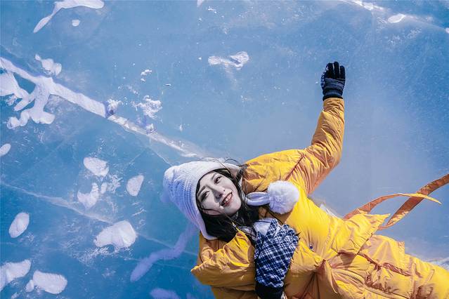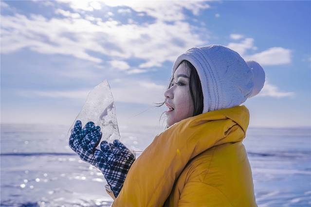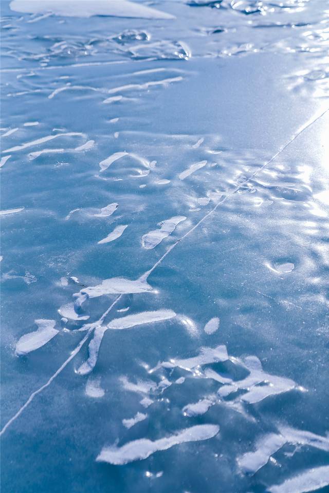我像个孩子一样,兴奋地在冰面上溜来溜去,对于南方人来说,尽管看过了各种下雪的场景,但第一次面对这么一大块结冰的湖面,还是兴奋不已。蓝天上的太阳明晃晃地照射下来,近看蓝色的冰面,从远处望去时,便会发现冰面反射出来的光眩晕了人的眼睛,四处一切又变成没有温度的冰冷色调。