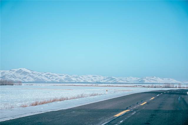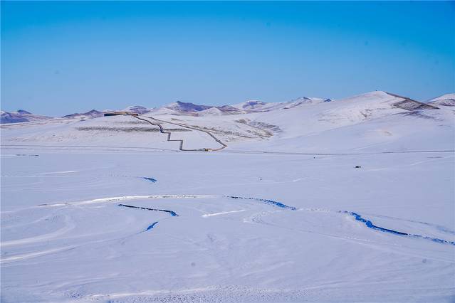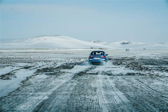 从水泥道路转入行驶在积雪上,才有种真正融入雪景的感觉,雪白和天际的蓝色连接在一起,不远处的山丘也是一片白色,从倒后镜往走过的雪地上看,雪白无痕的雪地上留下几条明显的车辙痕迹。在雪地里行驶的时候,需要十分小心,跟随别的车辆留下的车辙行驶,不然很容易遇到积雪厚的地方轮胎陷在里面进退两难。