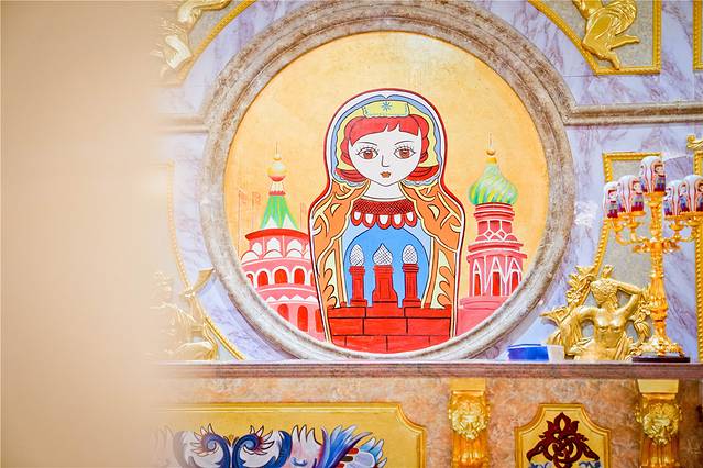 和酒店大堂连通的一条走道上,会看到许多俄式风格的油画,布满墙壁和天花板,水晶吊灯洒落温暖的微光,朦胧的金碧辉煌中带着一丝丝复古的氛围,漫步其中犹如走进艺术博物馆里面,根本想不到这会是一家酒店。