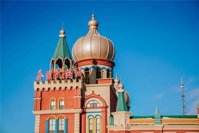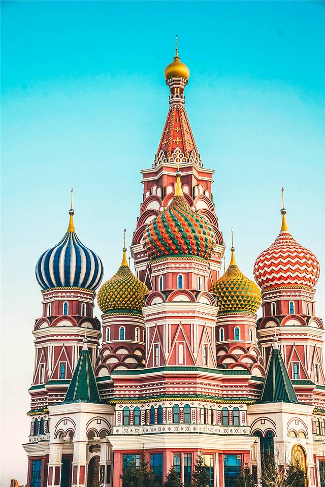 或斜线或波浪线的线条用不同的颜色搭配,勾勒出了与平时看到的洋葱头建筑不一样的外观,红的蓝的绿的丰富色彩,就像一座用糖果堆砌出来的城堡,相信没有女生不被其唤起少女心吧。