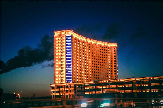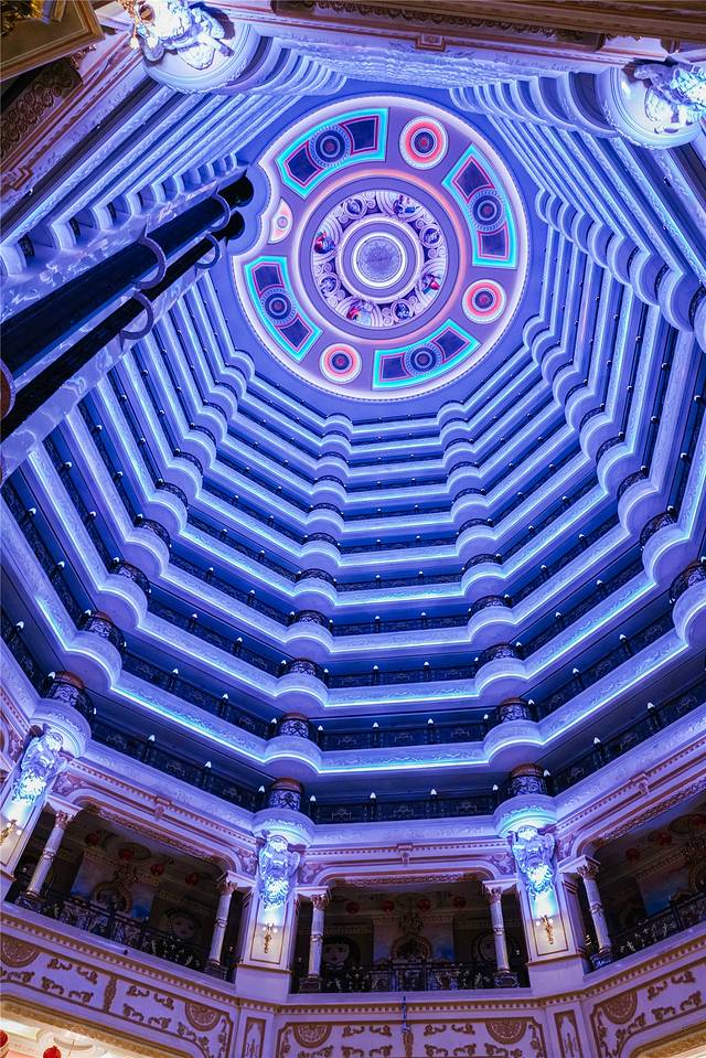 不仅外观吸睛,酒店里面同样金碧辉煌,内部是中空的设计,每一层都是回廊式的连接,而房间就置身与每一层的回环里面,全透明的观光电梯直通楼顶,因为没有透光,酒店内二十四小时都是开着金黄的灯光,随着观光电梯的升高,一层层的温暖灯光带给人一种穿梭在时光隧道的感觉。
