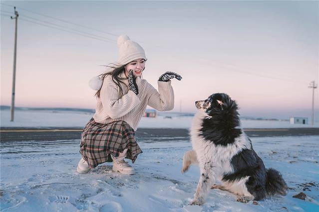 我们兴奋地下车拍照,没过多久突然有几条狗冲了过来向我们狂吠,我们被吓得惊慌失措,以为是我们闯进了陌生地带,狗狗们不欢迎我们呢。后来看见它们兴奋地对我们摇尾巴,一点都没有恶意。原来这些狗狗们都是牧民养的,或许在冬日里很少有过客,遇到我们都兴奋地一群簇拥而上。