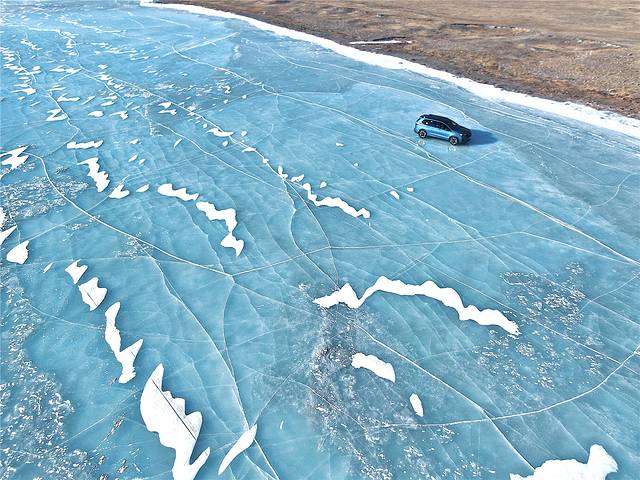 很早就想试试在冰湖面上开车是什么感受,这次终于有了这个机会。厚厚的冰面还足以承受车辆的重量,往湖面开时还有点担心,但被告知呼伦湖的冰面足有两米深时便放心大胆地往湖面开,开在冰湖上面没有一开始想象的滑。