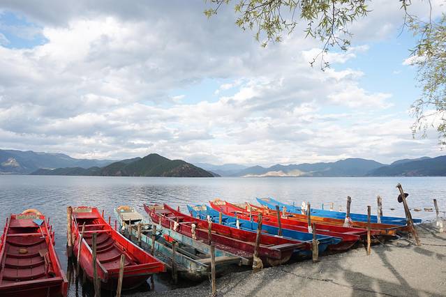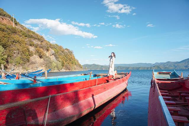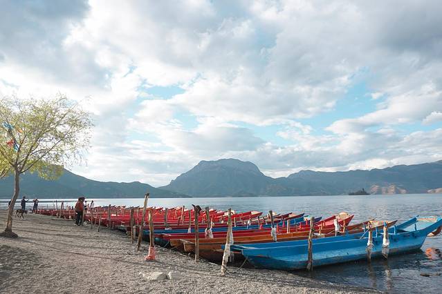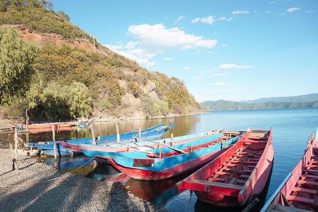 沿湖边走,还能看到五颜六色的独木舟,名叫“猪槽船”摩梭语称“日故”是由一根粗壮的圆木镂空,两头削尖而成。因为形状很像一只长长的猪槽而得名。