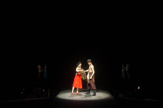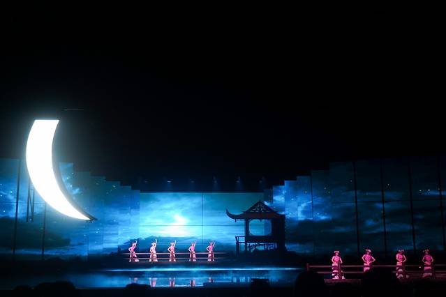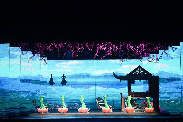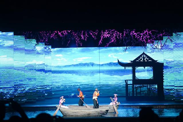 舞台开始泛起了绿水碧波,由暗到明的光幕里,一只小舟缓缓而来,漂亮的摩挲姑娘坐船头,而帅气的摩挲阿哥站在船尾,两人齐齐划桨而行,这你侬我侬的场面,太羡煞旁人了把!小船开到岸边,他们一起静看湖中盛开的花朵,还有那潮起潮落......