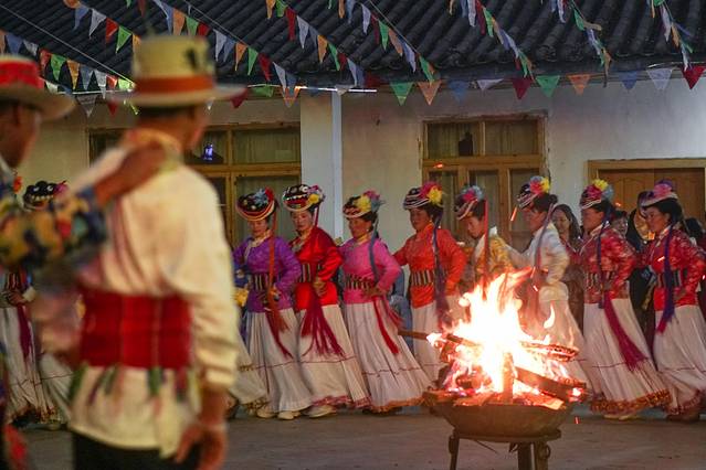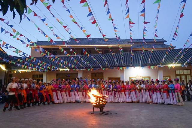 在摩梭族,篝火晚会是摩梭男女爱情的见证,男子遇见心仪的女生会邀其共舞,若有情意就会用手指扣女子手心,以此表达爱意。女子倘若有意,将会告诉男子自己花楼之地。夜晚12点以后,男子前来走婚。