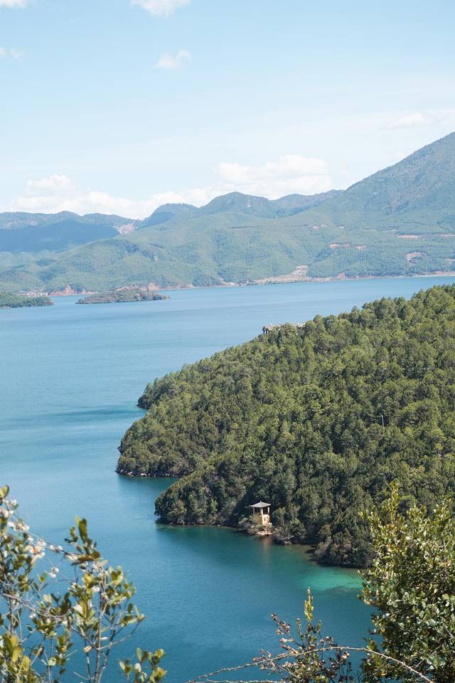 其他几座山像绿宝石一样浮于水面,蓝色的湖里还泛着绿光。