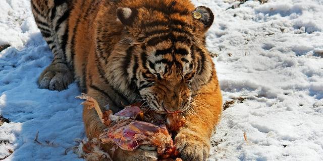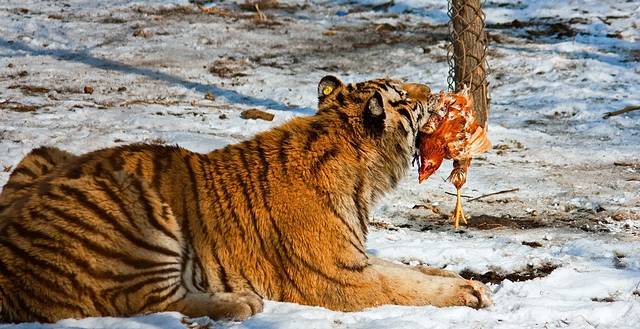 下了观光车,可以继续在园中步行游玩,走在步行区,可以买活鸡喂老虎,可以看到猛虎扑食,霎那间东北虎的本性就显现出来了。
