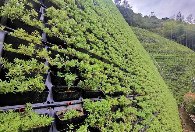 面积硕大的山体护坡,绿化全部采用钢架挂篮方式