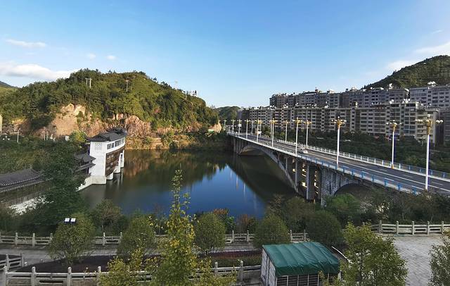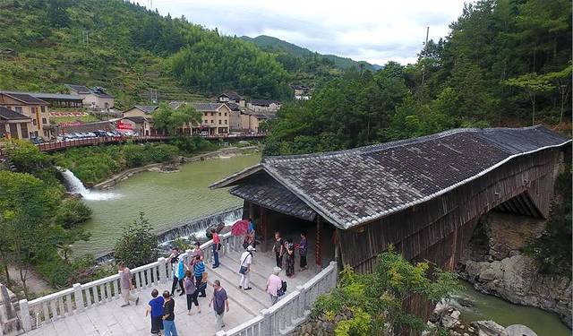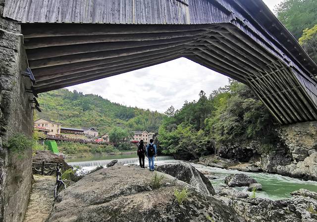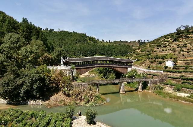 青山巍峨绿水缠绵,山水之间,木拱廊桥横跨其间,形成了“廊桥、流水、人家”的美景