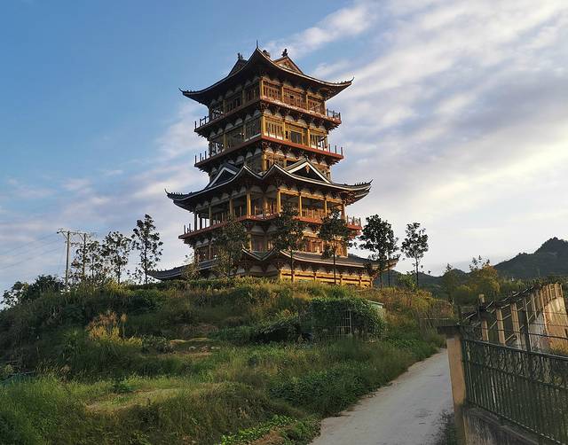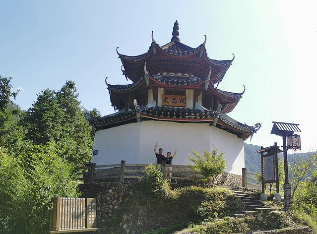 建于清道光年间,阁高三层,坐南朝北,八角形重檐攒尖顶,穿斗式木梁架