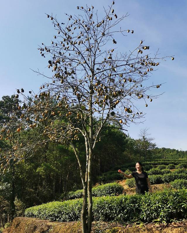 这棵独自长在茶园中的柿子树只见果实不见叶子