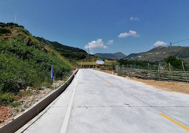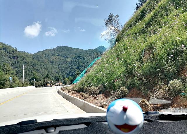 非常幸运的是,由国道235接到下党村的县道942改造工程,长度14.2Km,三天前才刚刚交工通车,公路边上插满了彩旗