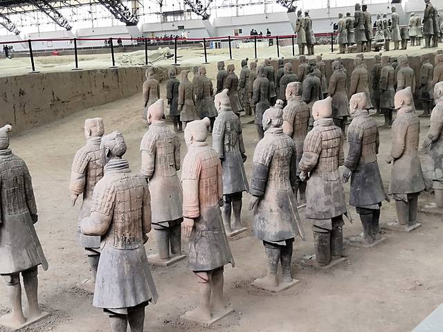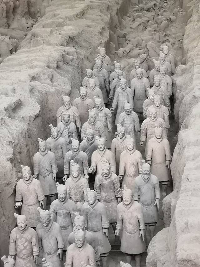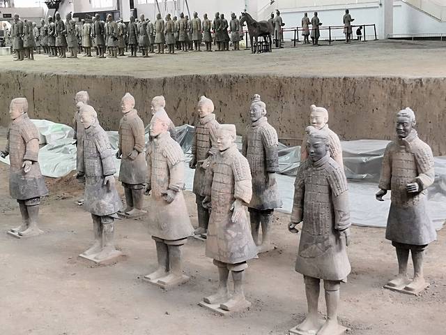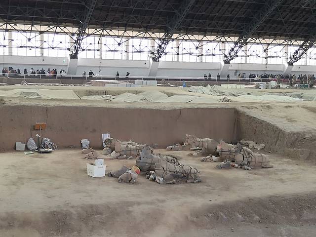 一号坑主要是步兵方阵,前面是已经修复完成的,后面由于保护需要,就重新填埋了。