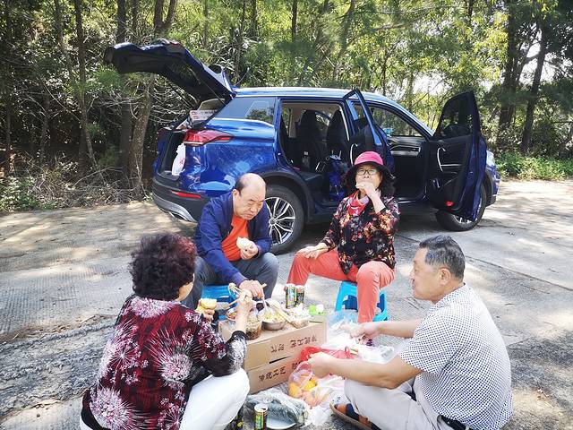 家人出行,自备四菜,找个凉快的地方开始野餐。