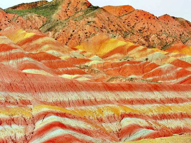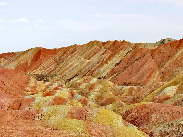 张掖最出名的旅游景点就是丹霞地貌,丹霞是指红色砂砾岩经过长期风化剥离和流水侵蚀而形成的孤立山峰和陡峭的奇岩怪石。这里的丹霞地貌发育于距今2亿年前的前侏罗纪至第三纪。
