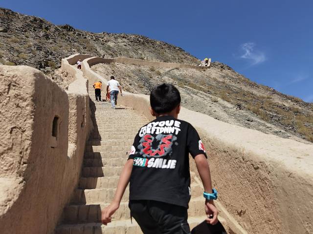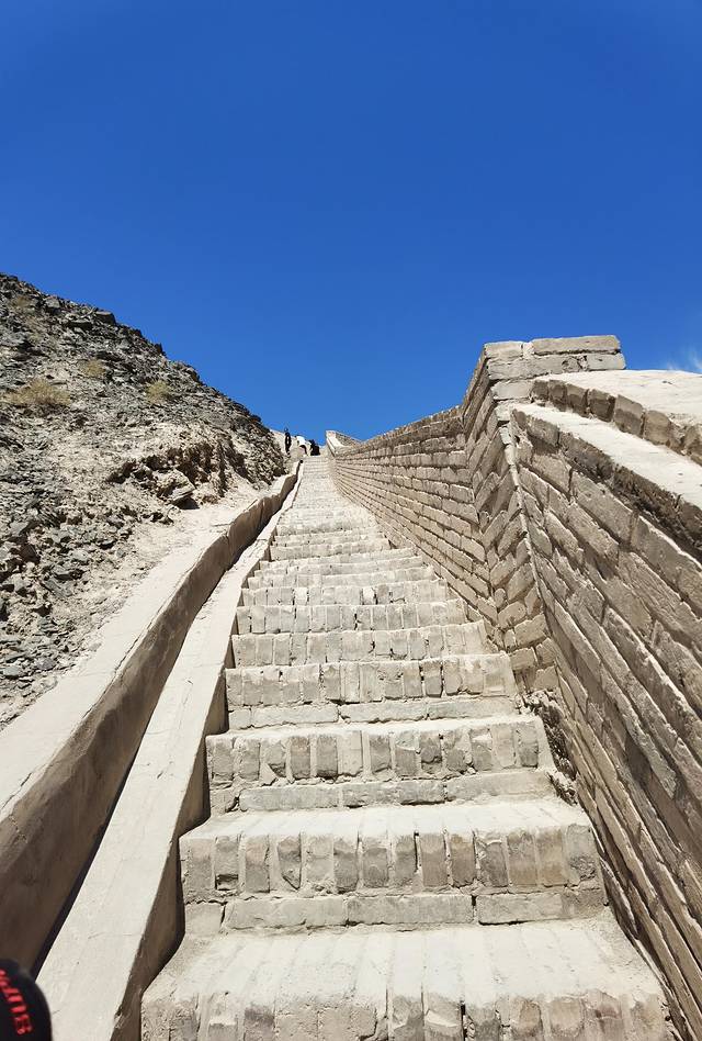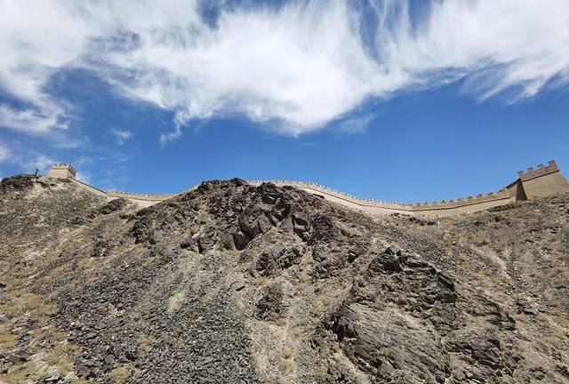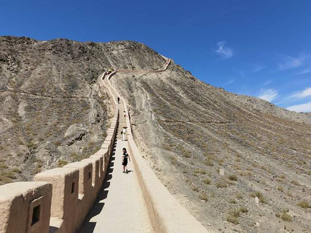 游览完第一墩之后,我们来到了第二站:悬壁长城。很多年前在北京登过长城,而嘉峪关这个悬壁长城最大的特点是这里的长城建在陡峭的山壁之上,最大倾斜度在45°,远看像一条巨龙盘旋在山上,可以想象得出当年建造时工匠们的艰辛。