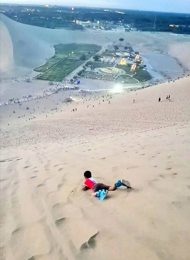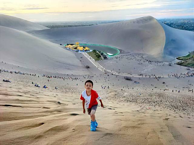 月牙泉的周围是一座座的沙山,山高百米以上,沙坡的坡度一般在30°-45°之间。儿子一看到沙山已经按耐不住,用最快的速度往上爬,眨眼已经爬到半山腰,喊都喊不住,我只好跟着往上爬。但我实在没他爬得快,而且爬了几十米已经是上气不接下气,只好沿着沙坡慢慢滑了下去。