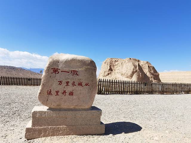 第一个站先到长城第一墩,其实这里没什么好看的,里面就一面旧城墙遗址和一块大石头,写着“万里长城从这里开始”。如果不是联票,估计来这里的人更少。游览这个景点不需要太长时间,连上等电瓶车的时间一个小时内可结束。