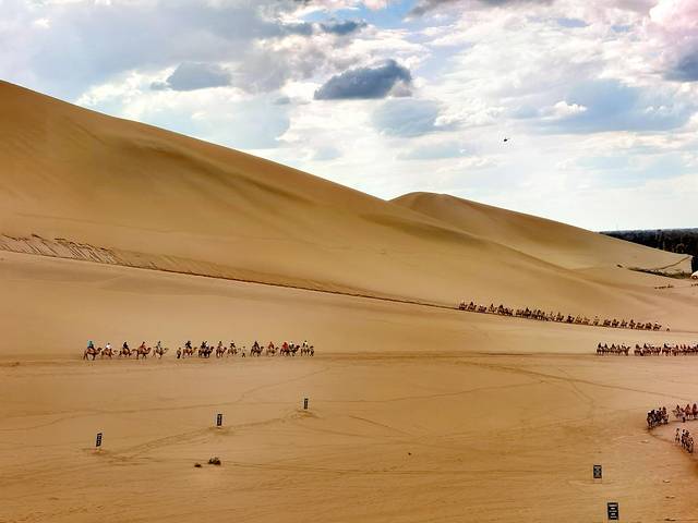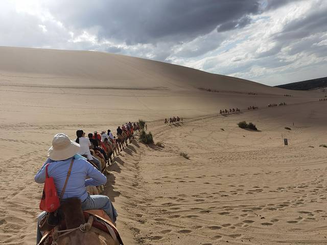 我们这一队人一坐上骆驼就开始不停地拍照和录视频,牵驼的大哥看到了,不停地大声制止,说骆驼胆子很小,特别是自拍杆,骆驼看见会害怕,以为要打它,可能会把我们甩下来,所以沿途禁止(自行)拍照。但是面对如此美景,很多人都没有理会,偷偷拿出手机来拍,那大哥一看见就骂。