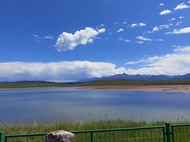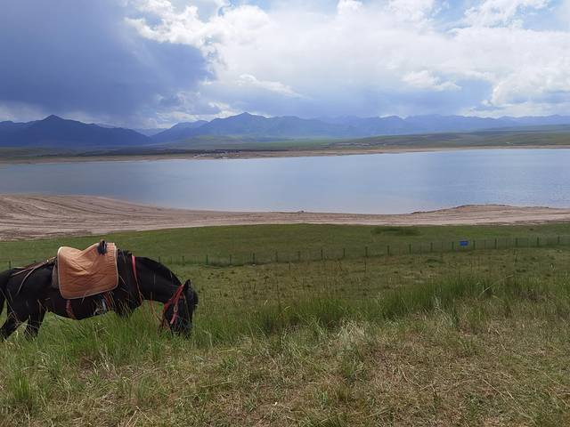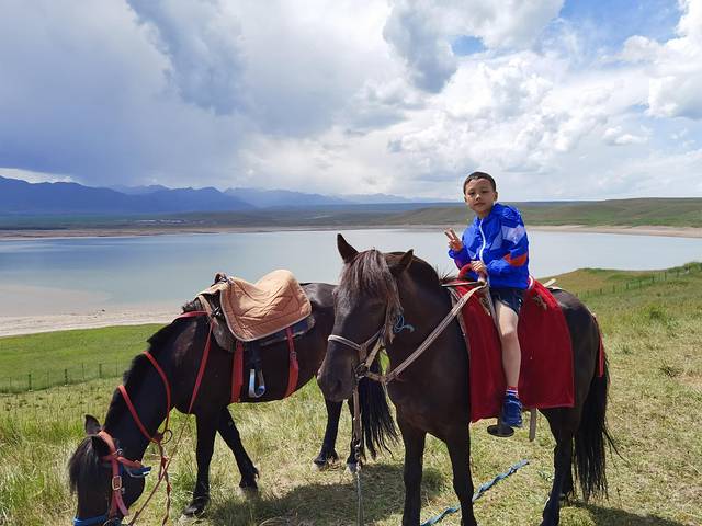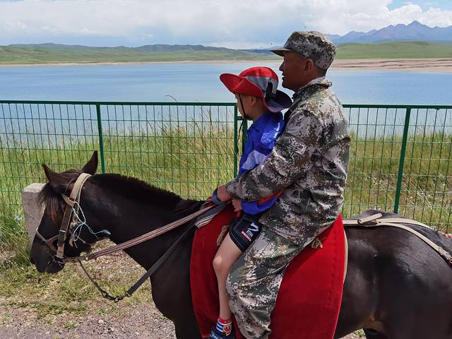 师傅说一直往里面走可以到祁连山脚下,可惜我们来回只有3个小时,不能骑到里面,但是这里的风景都已经十分怡人。我们在湖边下马歇了一会,也让马儿歇了一会,便往回走了,往回走的时候师傅让我儿子一个人骑,他在前面牵着马走,我一个人骑马走在前面,偶尔还小跑了一下,过了一下策马奔驰的瘾。