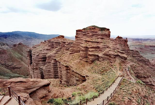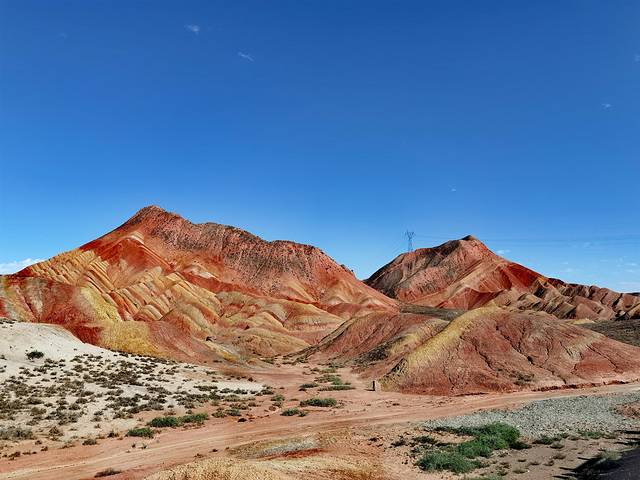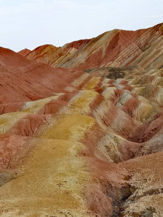 走完两个观景台之后就等于转了一圈,然后回到刚才下车的地方换乘电瓶车去往下一个观景点。第二个观景点同样有两个观景台,也是跟着石阶路绕一圈就逛完了。下山之后就坐电瓶车到第一个观景点换乘大巴到景区大门离开冰沟丹霞。此时是中午一、两点,阳光很猛烈,我们也不多作停留,打电话让美女司机来接我们前往下一个景点——七彩丹霞。
