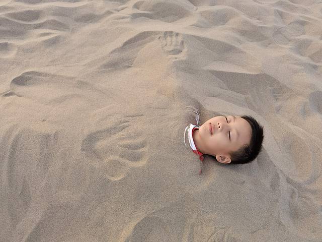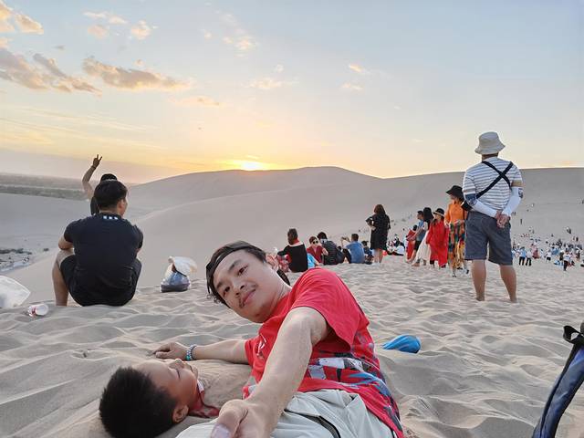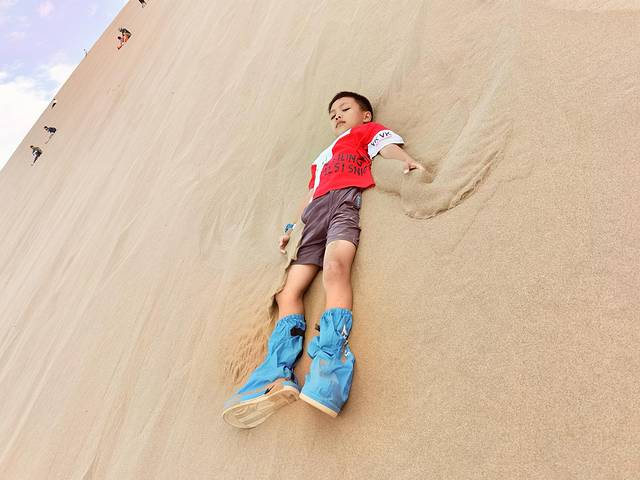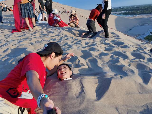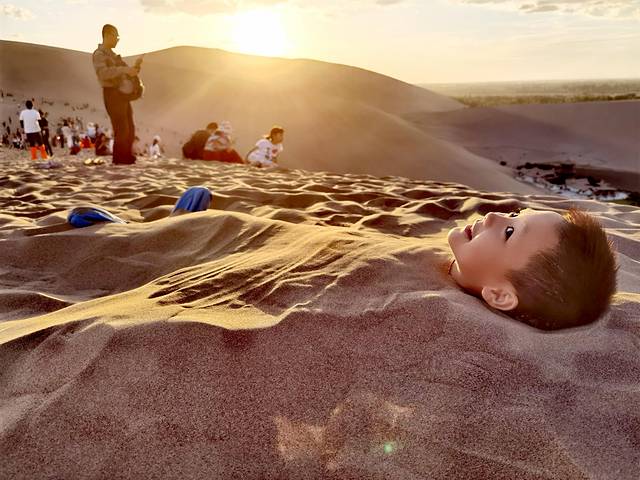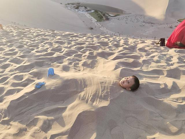 终于爬到山顶和儿子会合了,但是我们抬头一看,原来山上还有山。我们把心一横,既然都上来了,就继续往上爬,于是我们一起爬到最高处。这时候太阳开始下山了,我们就静静地躺在沙子上,舒服地看着日落的美景。儿子还让我用沙子把他的身子埋起来,做一个沙疗。