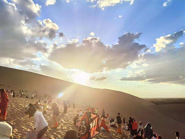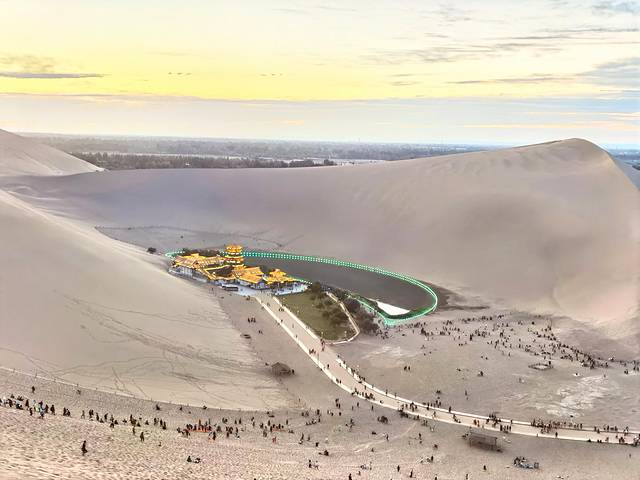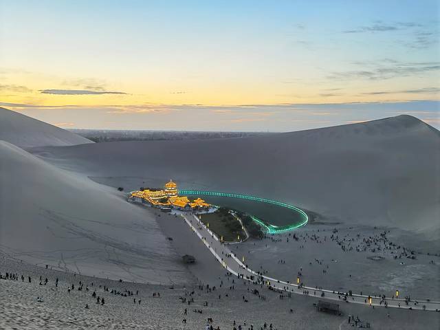 夜幕降临,鸣沙山月牙泉依旧很多人。